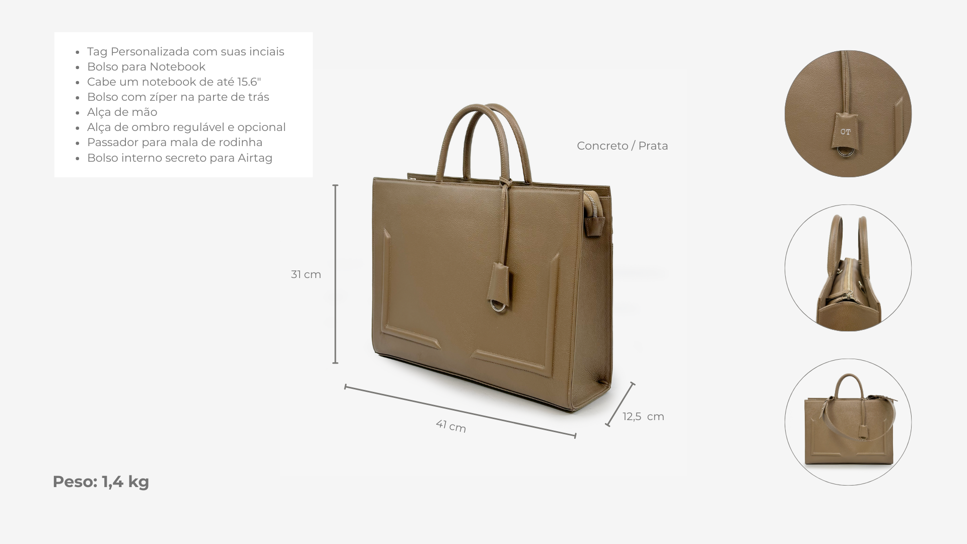 Seu amplo espaço (41 de comprimento x 31 cm de altura x 12,5 cm de largura) acomoda notebooks de até 15.6”, documentos e itens essenciais, com interior revestido em tecido camurça e bolso exclusivo para notebook. Conte ainda com um bolso secreto para AirTag e bolso traseiro com zíper para acesso rápido.
