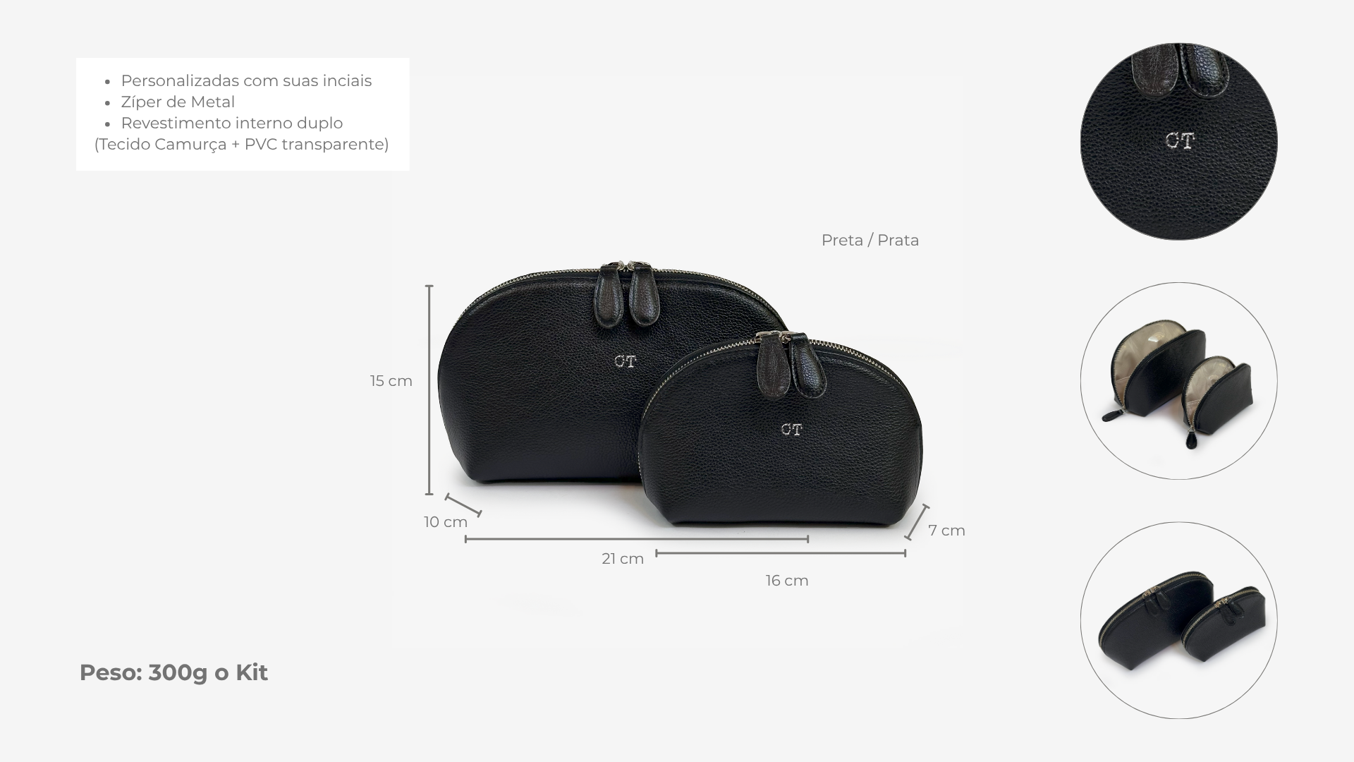 - Necessaire Fermer (maior): 21 cm × 10 cm × 15 cm — perfeita para produtos de higiene, carregadores e acessórios maiores.