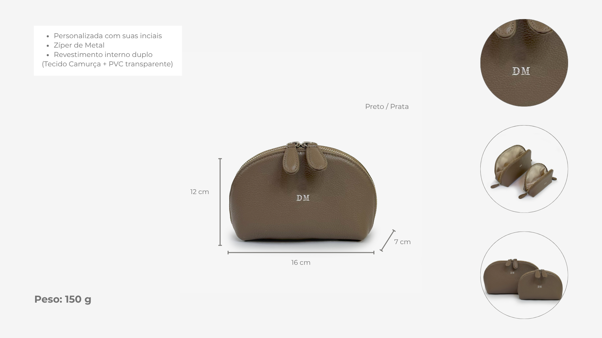 Sua forma compacta permite que ela seja facilmente transportada dentro de bolsas menores, mochilas ou malas de viagem, sem perder capacidade. A personalização em hot stamping das iniciais transforma a peça em um presente exclusivo e com forte apelo emocional.